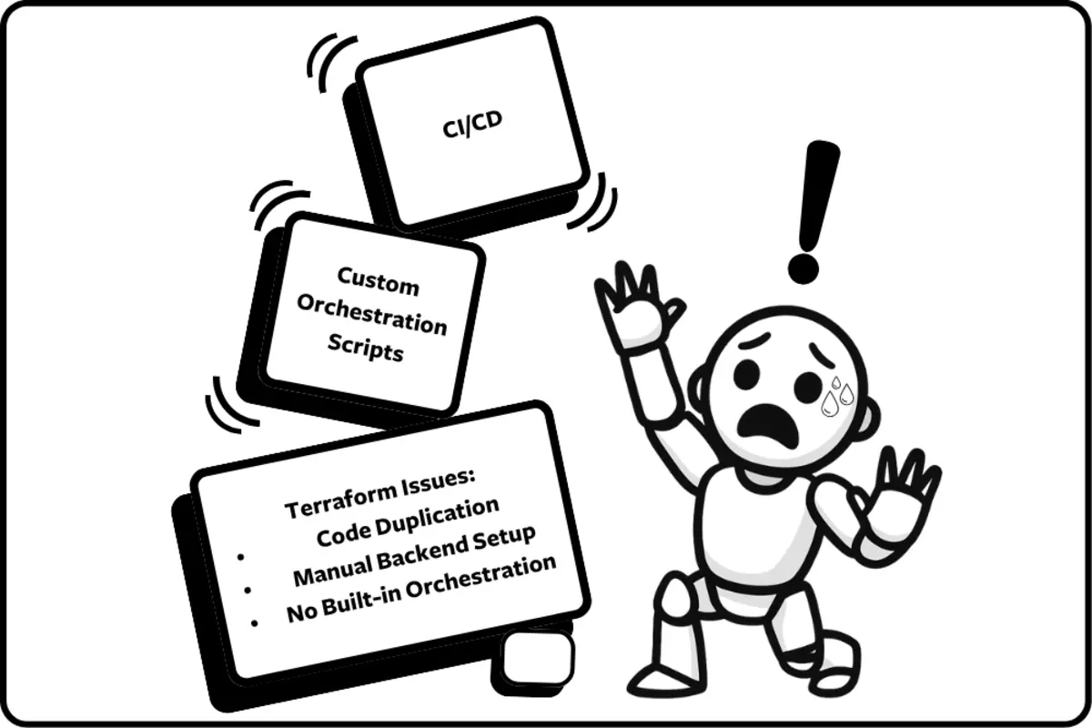 Manual backend state configuration. No built-in orchestration. Custom CI/CD scripts that break at the worst moments.