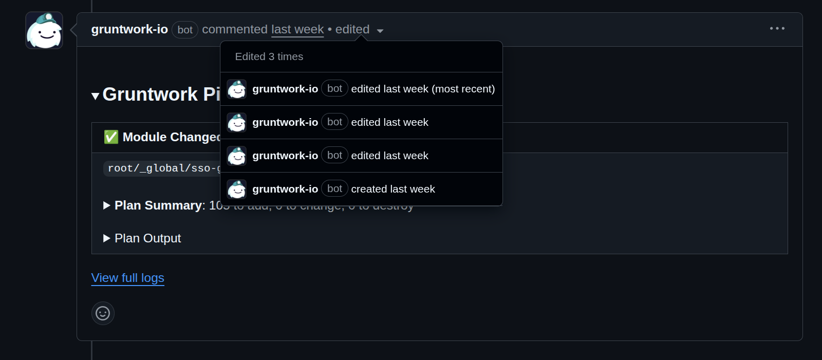 GitHub retains the history of all edits made to a comment, which means you can still easily access results from previous plans right from the pull request. Here’s what you’ll see: